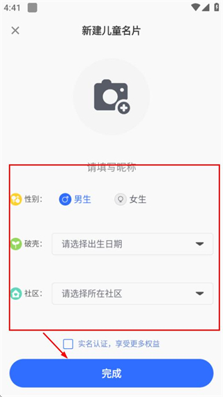 3、在新建兒童名片頁面,填寫信息后,點擊完成按鈕,即可完成兒童名片的新建。