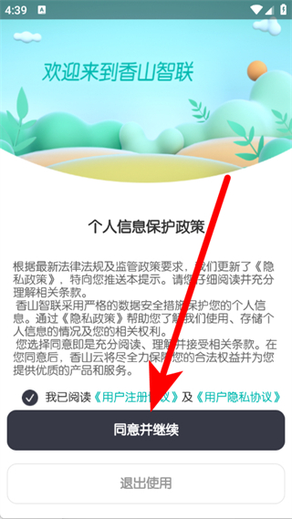 1、打開香山智聯(lián),在個(gè)人信息保護(hù)政策頁面勾選協(xié)議后,點(diǎn)擊同意并繼續(xù)。