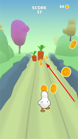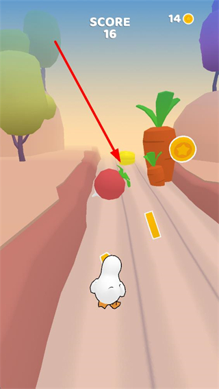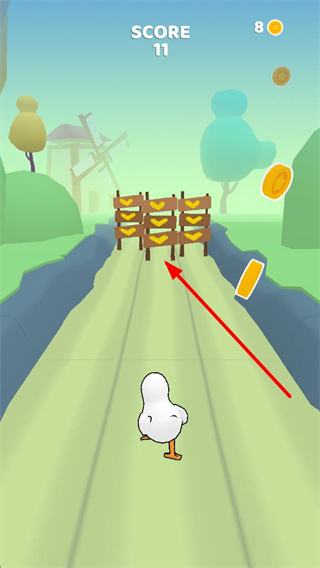 2、奔跑過程中點擊屏幕左右區(qū)域可控制鴨子左右、下蹲、跳躍,躲避道路中間或兩側(cè)的障礙物,如木柵欄、施工路障等。