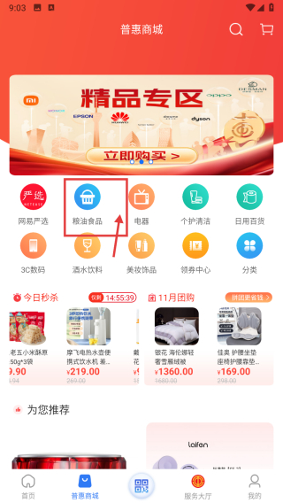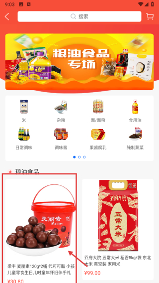 2、在普惠商城頁(yè)面,點(diǎn)擊糧油食品分類標(biāo)簽,進(jìn)入糧油食品商品列表頁(yè)。
