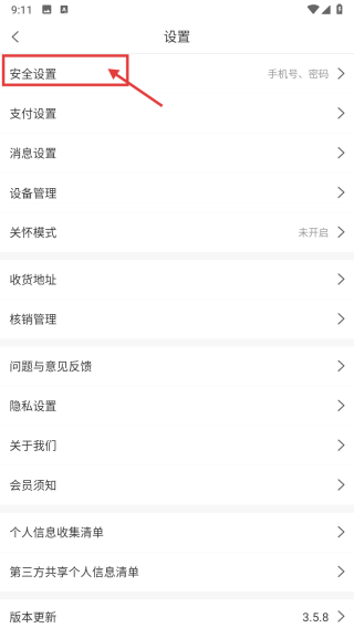 3、在設(shè)置界面,點擊安全設(shè)置選項,進(jìn)入安全設(shè)置頁面。