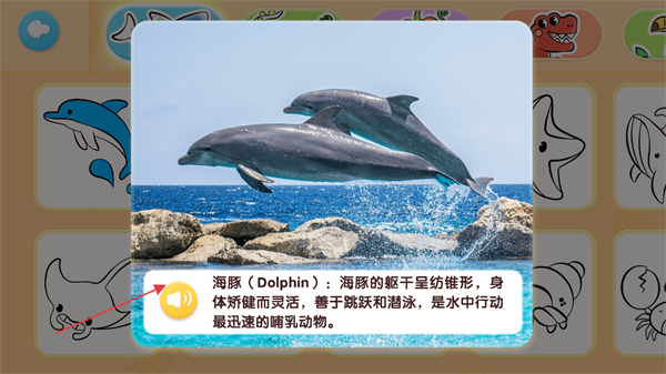 4、完成繪畫后點(diǎn)擊左上角的按鈕進(jìn)行提交,提交后會(huì)出現(xiàn)該動(dòng)植物的講解,點(diǎn)擊黃色播放按鈕進(jìn)行播放。