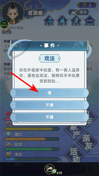 1、在游戲中,面對戲法事件時點擊信,選擇操作是推動劇情的關(guān)鍵操作,選擇后可觸發(fā)后續(xù)戲法相關(guān)情節(jié),豐富人生經(jīng)歷。