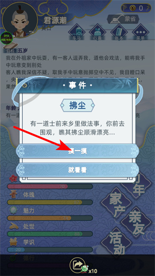 2、面對拂塵事件時點擊摸一摸,互動選擇是探索奇遇的核心步驟,選擇后可與道士的拂塵產(chǎn)生互動,獲得特殊機緣屬性提升。