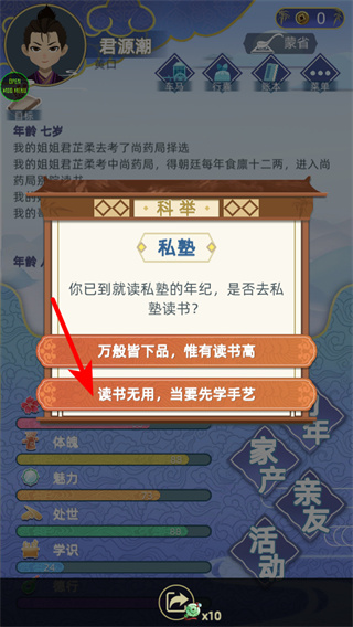 3、面對私塾就讀選擇時點擊讀書無用,當要先學(xué)手藝,發(fā)展選擇是規(guī)劃人生的關(guān)鍵環(huán)節(jié),選擇后走手藝發(fā)展路線,培養(yǎng)技能。