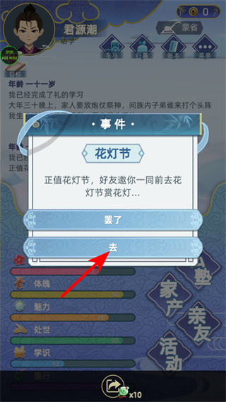 4、面對花燈節(jié)邀請時點擊去,社交選擇是拓展人脈的重要操作,選擇后可參與花燈節(jié)活動,結(jié)識好友,發(fā)展積累社交的資源。