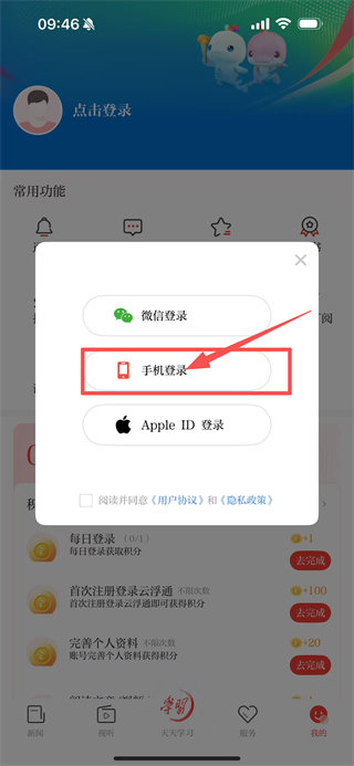 3、在登錄方式選擇彈窗中,點(diǎn)擊手機(jī)登錄,進(jìn)入手機(jī)號(hào)登錄頁面。