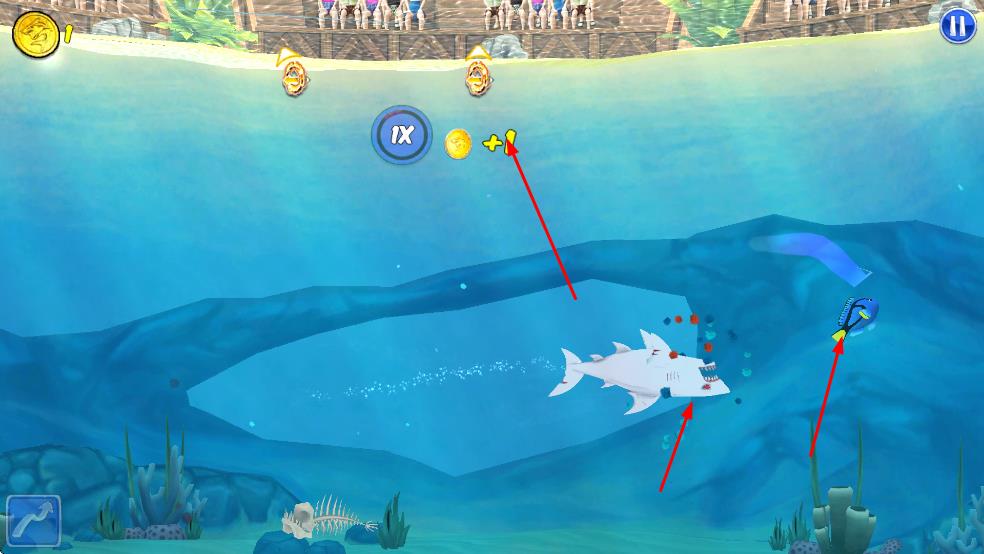 1、在水下場景中操控鯊魚移動,攻擊小魚等海洋生物,可獲取金幣獎勵,積累資源。