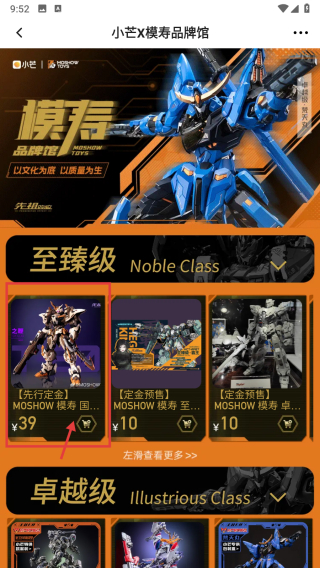 4、在品牌館頁面,瀏覽先行定金類機(jī)甲模型商品,了解商品詳情。