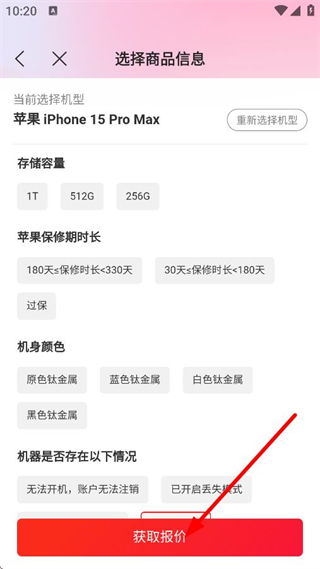 5、設(shè)置存儲容量、保修時長、機(jī)身顏色等信息后,點擊獲取報價,進(jìn)入提交幫賣頁面。