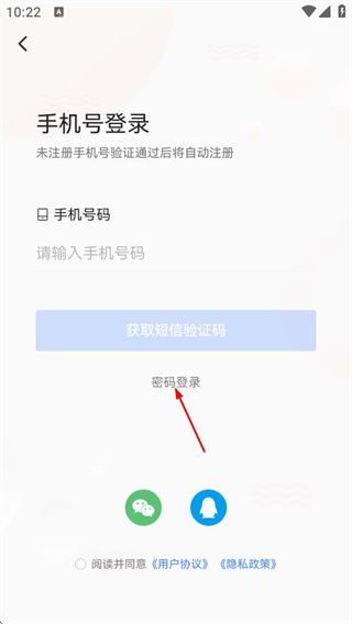 3、在手機(jī)號(hào)登錄頁面,點(diǎn)擊密碼登錄選項(xiàng),進(jìn)入密碼登錄頁面。