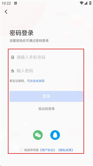 4、在密碼登錄頁面,輸入信息,勾選協(xié)議后點(diǎn)擊登錄,可完成密碼登錄。