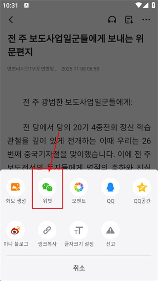 3、在分享選項(xiàng)菜單中,選擇微信選項(xiàng),可將該文章分享至微信。