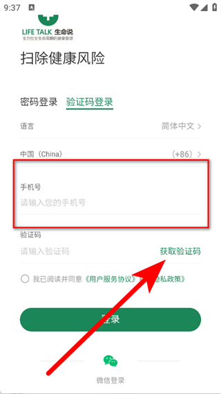 3、在登錄頁面,輸入手機號碼,點擊獲取驗證碼。