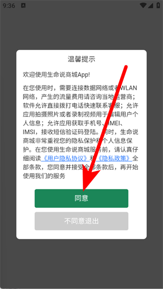 1、打開生命說商城,在彈窗中,點擊同意,進入登錄界面。