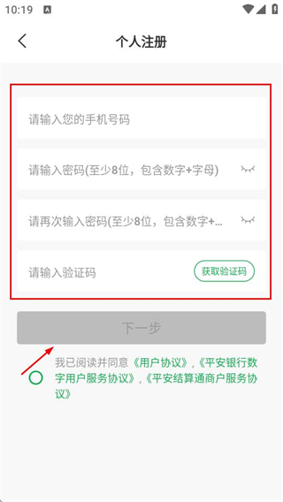 4、在個人注冊界面,依次填寫信息,勾選協(xié)議后點擊下一步完成注冊。