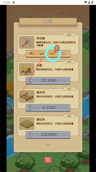 1、在建造界面升級采石鎮(zhèn),提升石塊采集量,為后續(xù)建設(shè)提供資源。