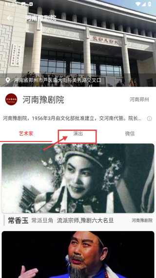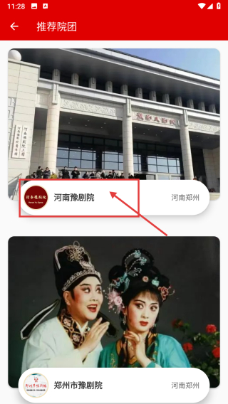 2、在劇院推薦頁(yè)面,點(diǎn)擊河南豫劇院,進(jìn)入劇院詳情頁(yè)面。