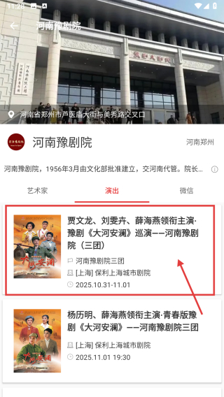 4、在演出列表中,可查看賈文龍、劉雯卉等領(lǐng)銜主演的豫劇大河安瀾巡演等演出信息。