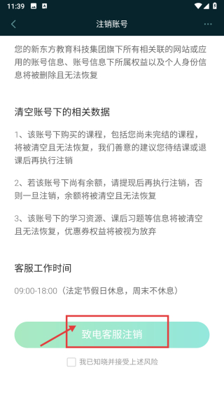4、在注銷賬號(hào)說(shuō)明頁(yè)面,勾選我已知曉并接受上述風(fēng)險(xiǎn),點(diǎn)擊致電客服注銷按鈕,完成賬號(hào)注銷操作。