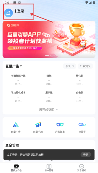 1、打開(kāi)營(yíng)銷(xiāo)類(lèi)APP,點(diǎn)擊左上角未登錄區(qū)域,進(jìn)入登錄界面。