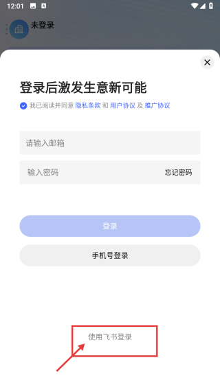 2、在登錄界面,點(diǎn)擊使用飛書(shū)登錄選項(xiàng),進(jìn)入飛書(shū)登錄頁(yè)面。