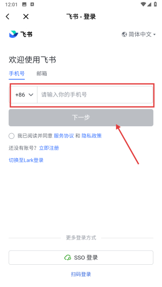 4、在賬號(hào)登錄界面,輸入手機(jī)號(hào),點(diǎn)擊下一步,完成飛書(shū)賬號(hào)的登錄操作。