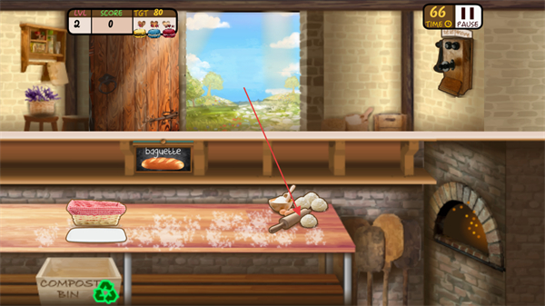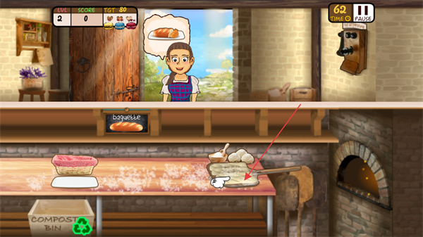 2、進(jìn)入餐廳后,在顧客還未來之前先進(jìn)行面包的制作,點(diǎn)擊搟面杖進(jìn)行面包的制作。