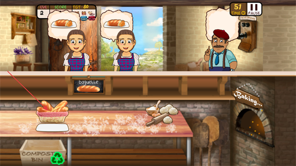 4、點(diǎn)擊籃子里的面包,放入盤子中并交付給顧客獲得金幣。