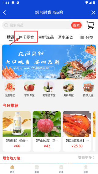2、在嗨易購(gòu)商城選項(xiàng)頁(yè)面,點(diǎn)擊頂部的休閑零食欄目。