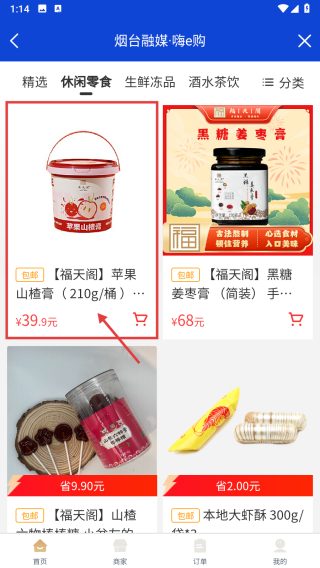 3、在休閑零食欄目中點(diǎn)擊蘋果山楂膏的商品。