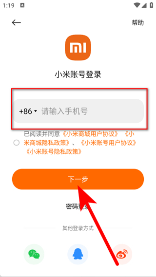 3、在登錄頁面,輸入手機(jī)號碼,勾選后,點擊下一步。