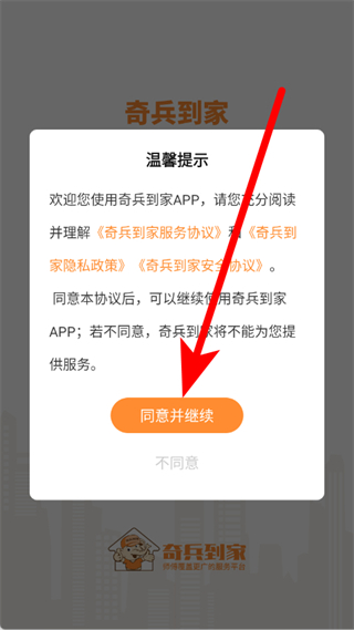 1、打開奇兵到家,在彈窗中點(diǎn)擊同意并繼續(xù),進(jìn)入登錄界面。