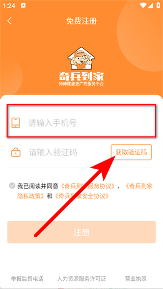 3、在注冊頁面,輸入手機(jī)號(hào)碼,點(diǎn)擊獲取驗(yàn)證碼。
