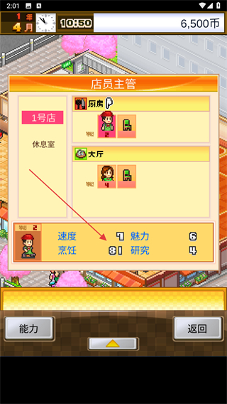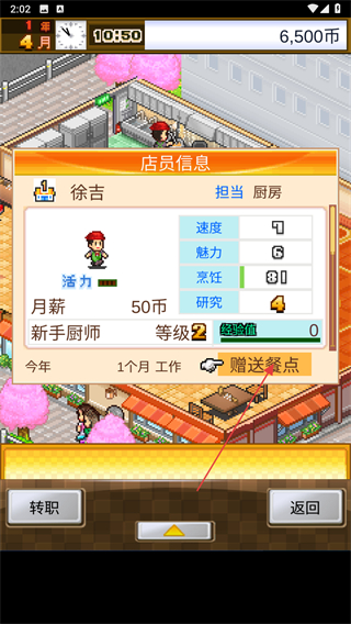 3、點(diǎn)擊店員可以贈(zèng)送餐點(diǎn)進(jìn)行店員的能力和等級(jí)的提升,或是點(diǎn)擊下方的轉(zhuǎn)職按鈕進(jìn)行轉(zhuǎn)職。