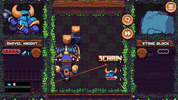 2、控制鏟子騎士移動(dòng),靠近方塊區(qū)域進(jìn)行消除,形成連鎖反應(yīng)如3CHAIN可獲得額外獎(jiǎng)勵(lì)。