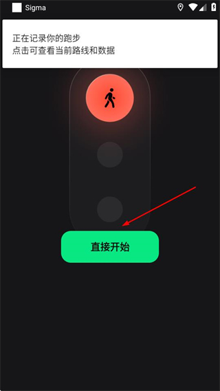 2、在跑步記錄開始界面點(diǎn)擊直接開始,進(jìn)入運(yùn)動中界面。