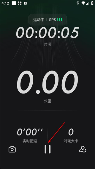 3、在運(yùn)動中界面可查看運(yùn)動距離和時間,點(diǎn)擊暫停鍵可暫停運(yùn)動。