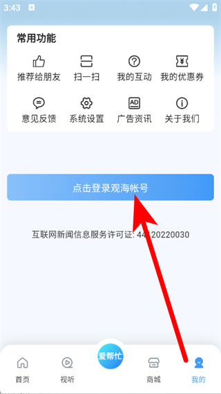2、在個人中心頁面,點擊登錄觀海帳號,進入登錄界面。