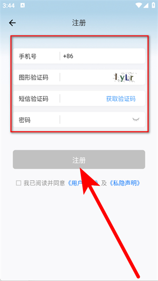 4、填寫手機號、圖形驗證碼,點擊獲取驗證碼,勾選同意協(xié)議后,點擊注冊按鈕,完成注冊。