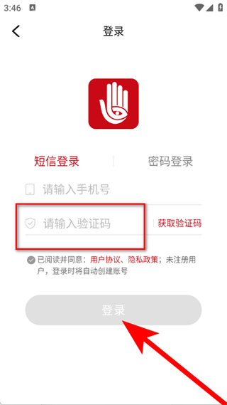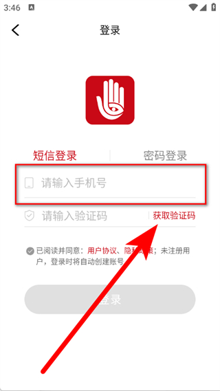 3、在登錄頁面,輸入手機(jī)號后,點擊獲取驗證碼。