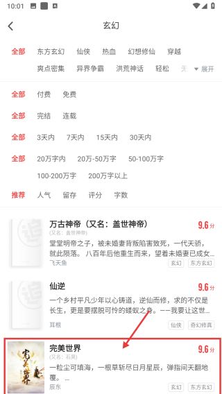 3、在玄幻小說列表頁面,選擇完美世界小說,進(jìn)入小說詳情頁面。