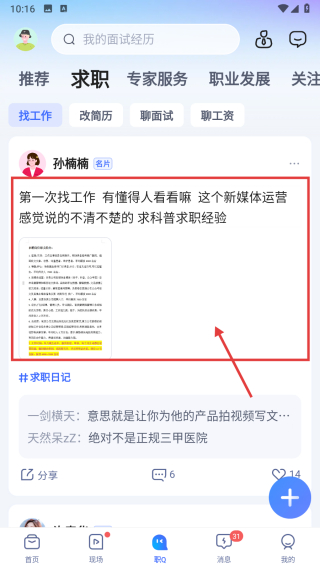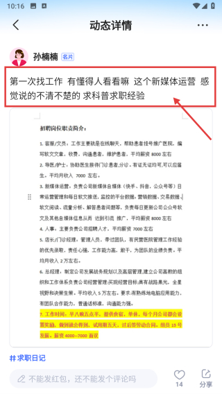 4、在動(dòng)態(tài)詳情頁(yè)面,查看該動(dòng)態(tài)的詳細(xì)內(nèi)容,了解求職經(jīng)驗(yàn)信息。