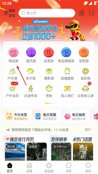 1、在游俠客首頁,點擊周邊游選項,進入周邊游頁面。