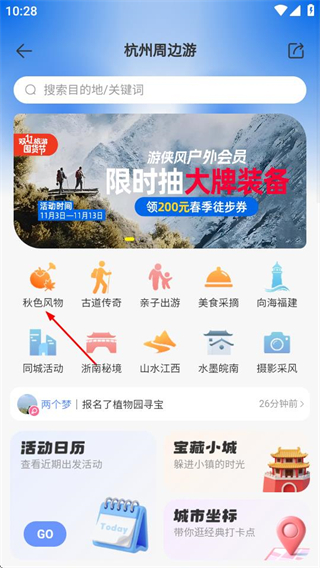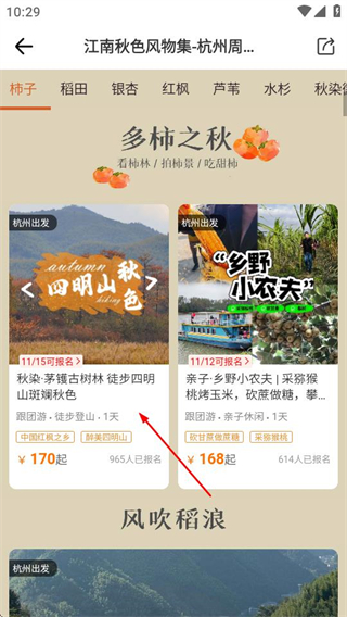 2、在周邊游頁面,點擊秋色風物選項,進入秋色風物活動列表頁面。