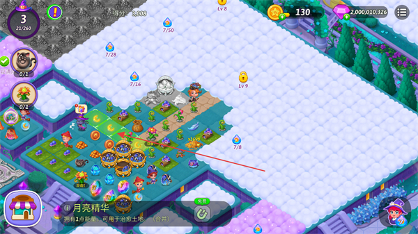 3、收集月亮露珠,用于治愈土地,拓展操作區(qū)域,為合并元素做準(zhǔn)備。