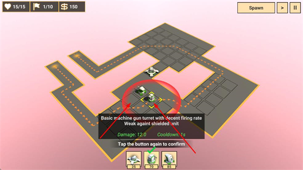 1、消耗金幣在地圖關(guān)鍵路徑旁部署防御塔,開(kāi)啟敵人防御進(jìn)程。