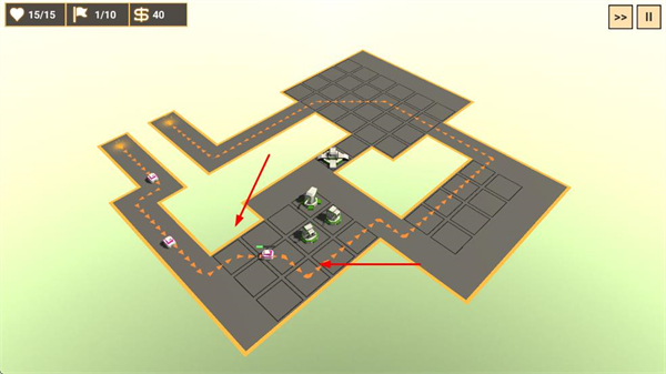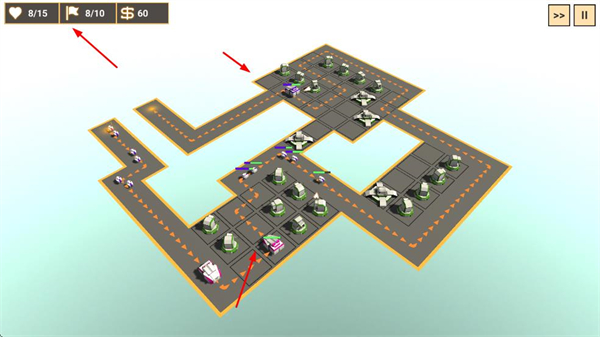 2、敵人沿路徑來(lái)襲時(shí),利用已部署的防御塔進(jìn)行攻擊,阻止其通過(guò)路徑。