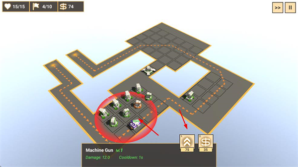 3、消耗金幣升級(jí)防御塔如機(jī)槍塔升級(jí)后屬性提升,增強(qiáng)防御塔的攻擊能力,提升清敵效率。