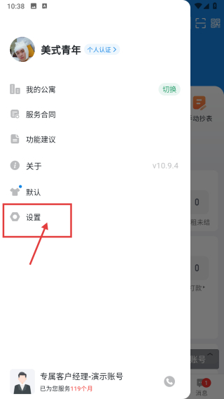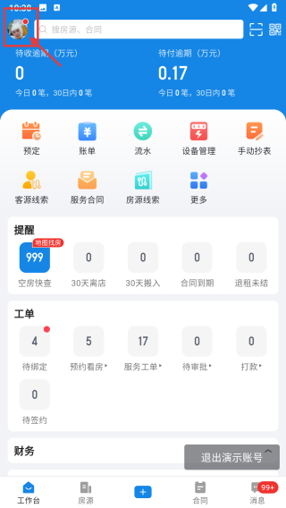 1、打開(kāi)公寓管理類APP,點(diǎn)擊左上角頭像,展開(kāi)個(gè)人功能列表。